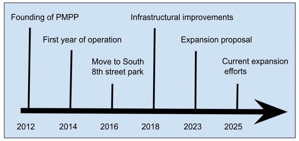 At this point, the PMPP board decided that continuing operations at the South 8th park location was no longer viable. Funds raised by the PMPP normally used for operation were diverted to obtaining blueprints, assessing structural needs of the new location, and expanding our fundraising capabilities. The old rink was dismantled, in preparation for the site being returned to the parks and recreation department. This lapse in operation allowed the board of directors to examine the organizational front of the PMPP as well. Improvements for professional expansion were implemented, and additional members brought experience and depth to the capabilities of the board.